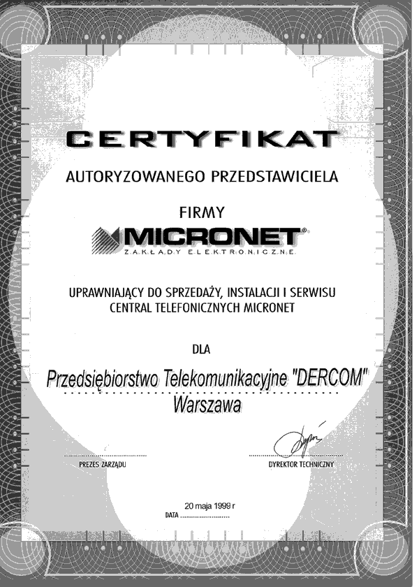 Zaświadczenie dla firmy Dercom iż jet autoryzowanym